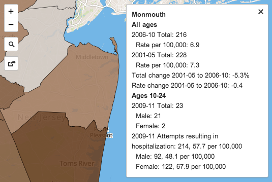 Monmouth County had 216 suicides from 2006-2010, which equates to a rate of 6.9 suicides per 100,000 people. New Jersey’s rate was 7 during that time period, according to the report.