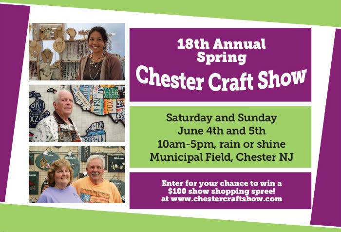 18th Annual Spring Chester Craft Show June 4 & 5, 2016 *RAIN OR SHINE* Municipal Field & Perry St., Chester, NJ www.ilovechester.com