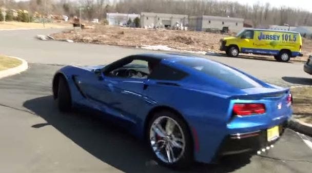 Pictured: NJ 101.5 FM News Director Eric Scott drives off in a Corvette. Photo Credit: Screen Capture of YouTube Video.