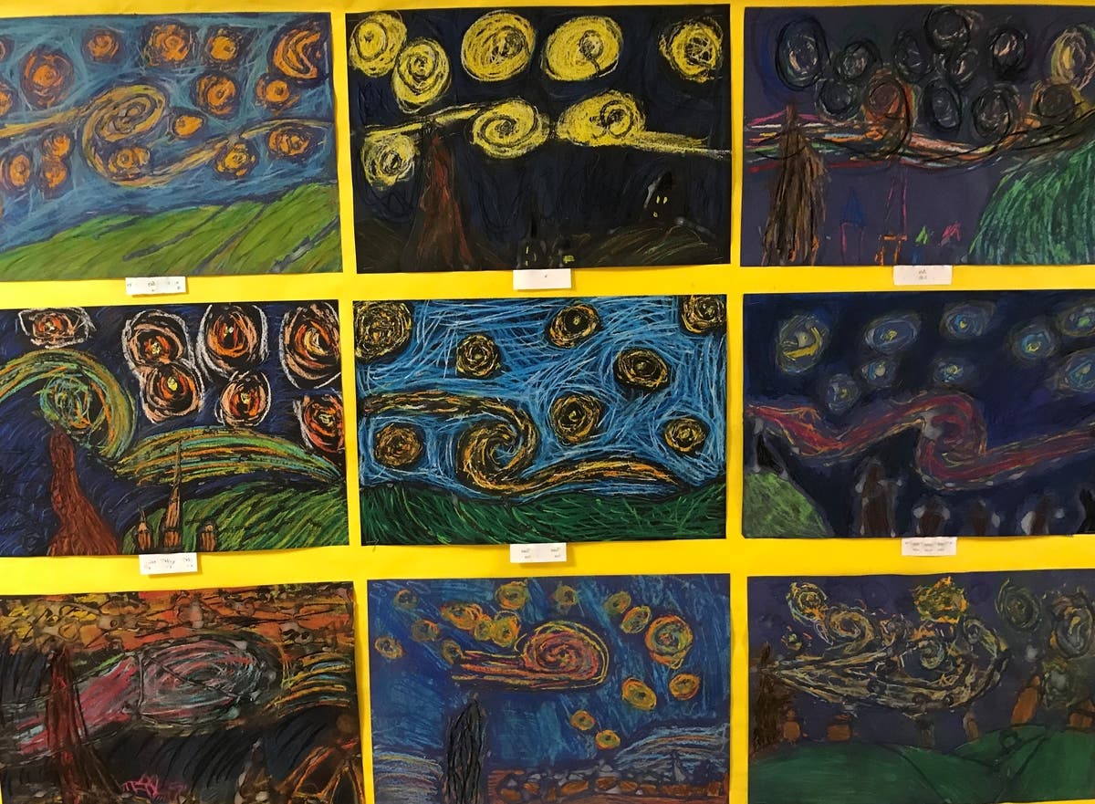 Next, the students are introduced to different techniques employed by the artist. Some techniques were standard and some techniques were new or enhanced by Van Gogh. The students begin to build their artistic skill set by using them in their own creations. The students are encouraged in the execution of these techniques to express their own feelings and emotions. For example, Van Gogh may have favored the color yellow in painting his “Sunflowers,” while Mrs. Bizzarro’s students were invited to use either warm or cool colored oil pastels as a palette for their creation. At the same time, by using mark-masking techniques the students had the opportunity to apply new ways of adding depth and texture to their art. Another assignment for students was to create their own “Starry Night.” Students learned how to describe the movement they could see in the original masterpiece. How the artist can take the viewer’s eye from the sky to the peaceful town and back up to the sky. You can see several examples of the students’ new and unique art pieces by visiting the School’s Facebook site.