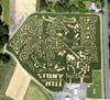 An aerial view shows Ort Farms’ corn maze on Bartley Road with the iconic photo of a person walking a leashed dog with the inscription, “The Seeing Eye” in the layout.