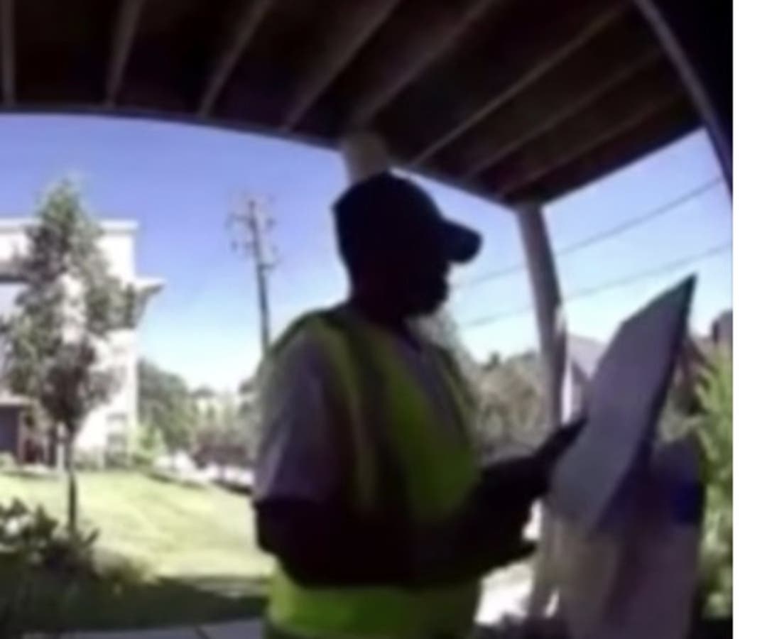 The video shows an Amazon delivery person place a package on the porch and return to his vehicle. A few moments later, the diver exits and approaches the residence again.