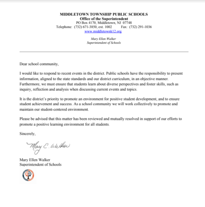Middletown schools superintendent Mary Ellen Walker, who just took the job Aug. 1, put a public letter up Wednesday on the Middletown school district website. It read, in part: