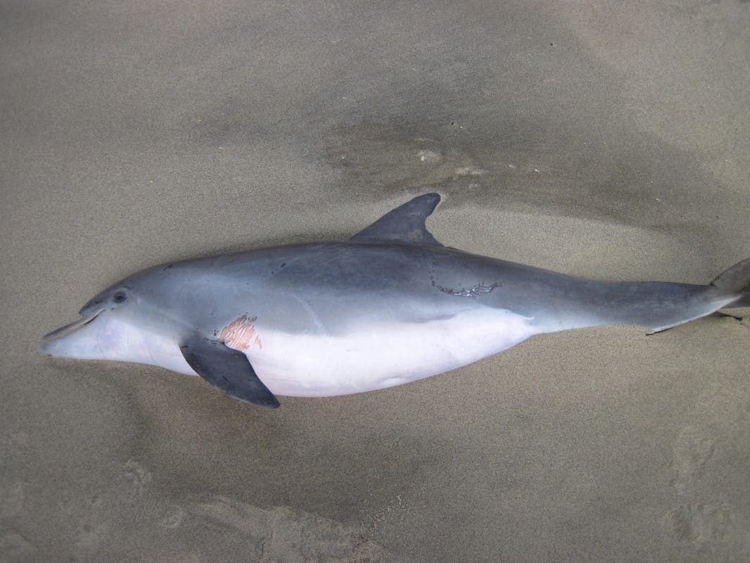 The female dolphin had a large shark bite taken out of her side, but it was healed. She was not pregnant, contrary to other reports.