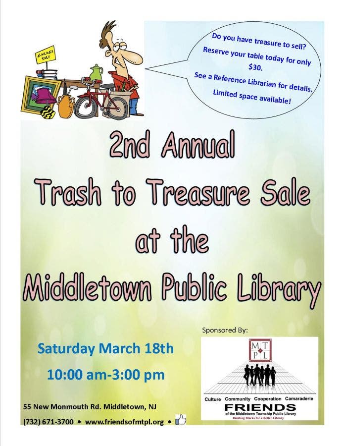 The Friends of the Middletown Township Public Library is having its 2nd Annual Trash to Treasure Sale at the Library, 55 New Monmouth Road, Middletown on Saturday, March 18th, 10:00 am - 3:00 pm. Find a wide array of exciting treasures while supporting the program activities of the Library.