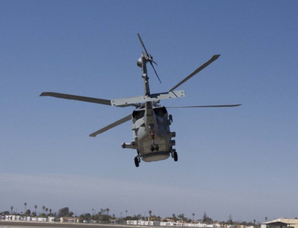 The helicopter, which is grey with a black bottom and stripe, can be identified by its tail number, Tail # N555JC.