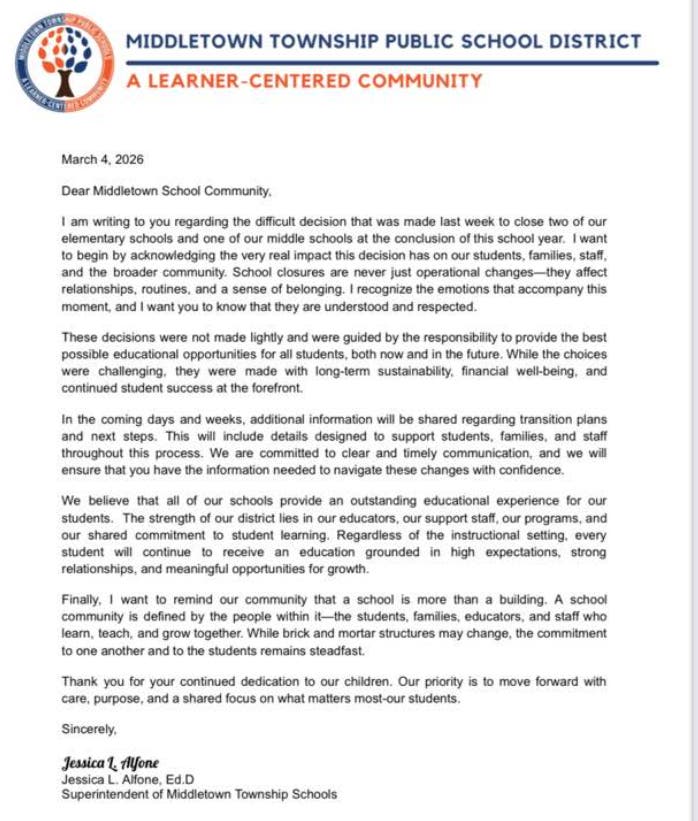 MIDDLETOWN, NJ — On Wednesday, Middletown school superintendent Jessica Alfone sent a letter home to parents on the district's plans to close three schools.