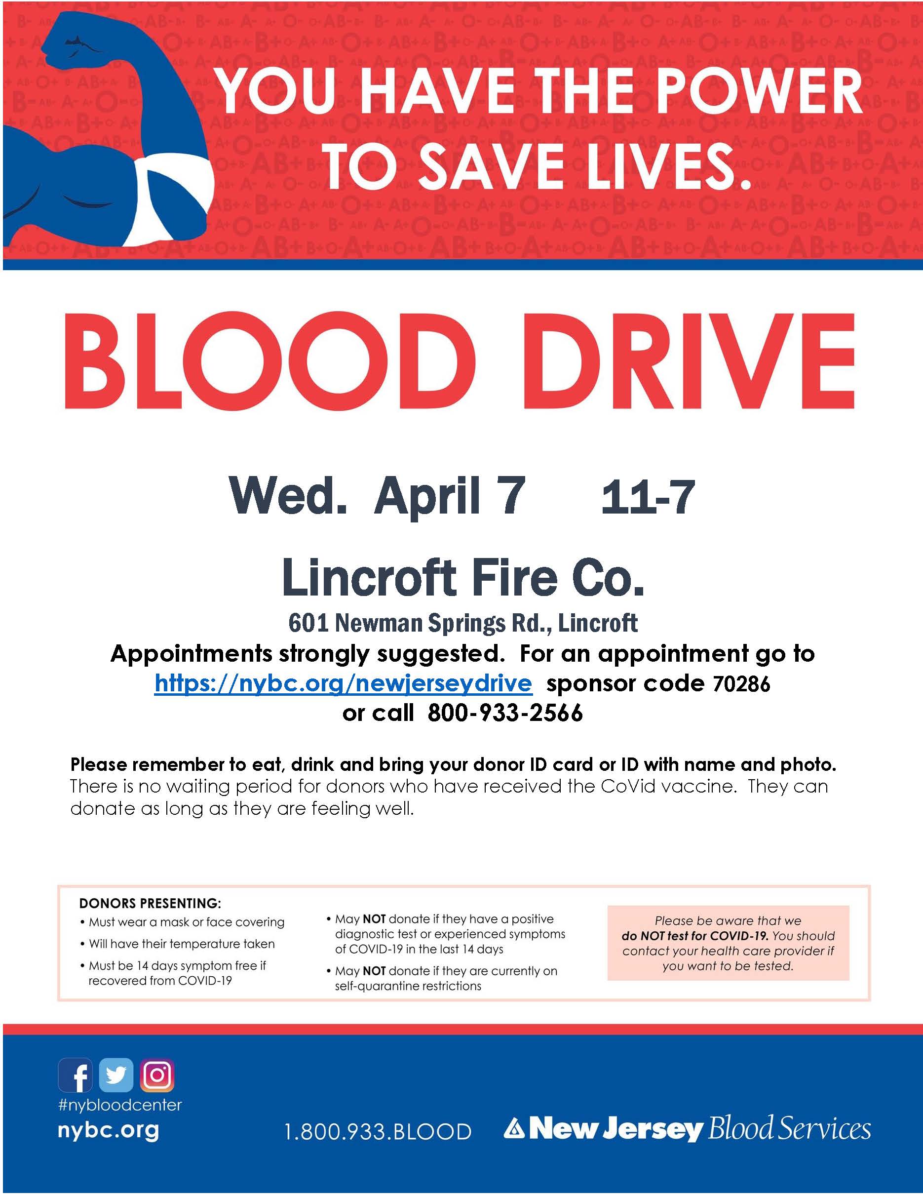 The blood drive will go from 11 a.m. to 7 p.m. at Lincroft Fire Company, 601 Newman Springs Road. You can just walk in, but appointments are strongly suggested. Make an appointment at https://donate.nybc.org/donor/... Sponsor code: 70286