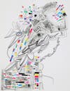 "I started by listening to streaming talk radio, while drawing with pen, graphite, washes and some collage fragments of objects in my home," Yaniv said. "These objects emerge from different vantage points: basic craft tools such as scissors, white out and latex gloves juxtapose with technology items like cables, computer icons and cell phones. Text enters the work simultaneously with the images. Whether carefully written or half erased, the multi-lingual texts I transcribe from American and Israeli media become an integral part of these choreographed mindscapes."