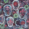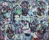 As an example, she pointed out a series of four paintings with a skull theme. She created a stencil skull shape and used it on each painting. Sometimes it appears as a negative image and sometimes it is more apparent. She repeats the skulls a number of times creating a pattern that is just one layer of the painting. She also stenciled flowers and bursts of color to create energy.