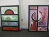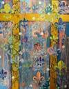 As a result, most of her earlier, more geometric works, have black lines that create a frame around the colorful passages inside. Eventually, she eliminated the black lines and began to create layers with stencils and modeling paste to create texture. At one point, she decided to combine the two elements in her work and began to use both stencils and thick black forms.