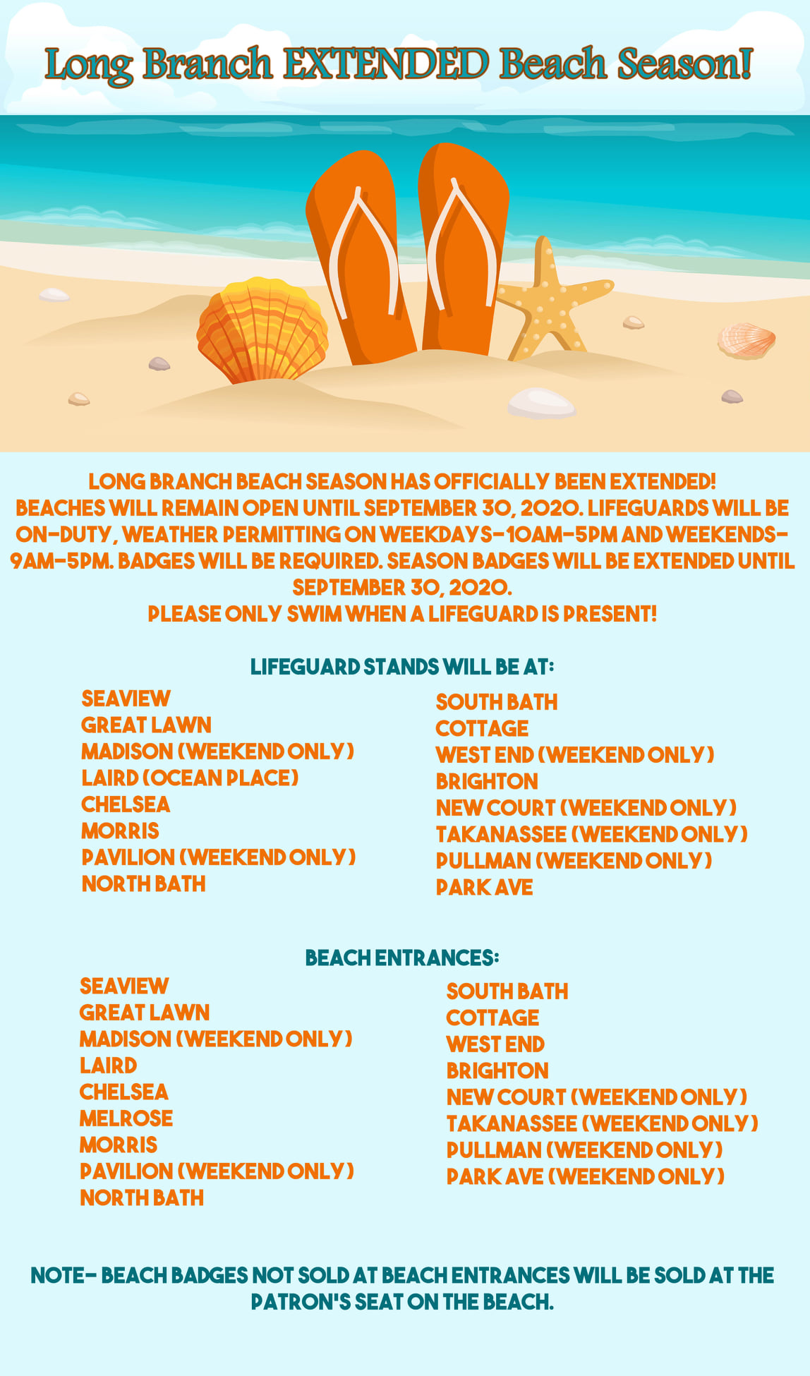 Up and down the Jersey Shore, other towns are similarly extending the summer beach season: Long Branch officially extended its summer beach season to Sept. 30. Lifeguards will be on duty weekdays and weekends until Sept. 30 and badges will be required.