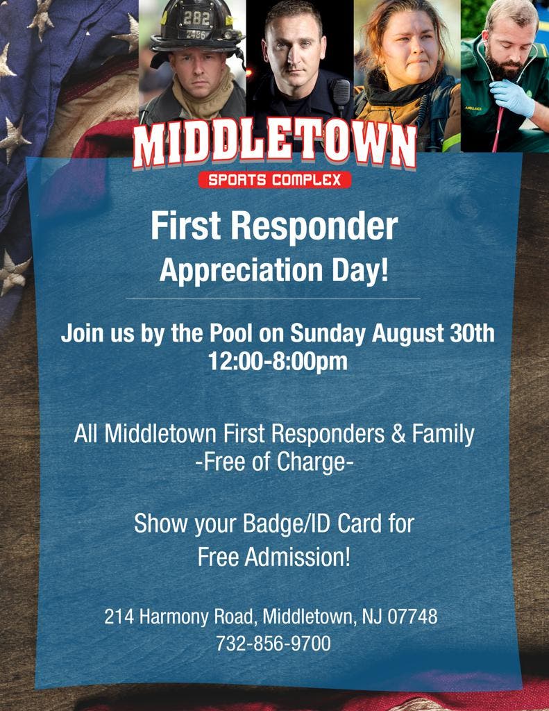 MIDDLETOWN, NJ — The Middletown Sports Complex is proud to announce that it will be having a Middletown First Responder Appreciation Pool Day on Sunday, August 30.