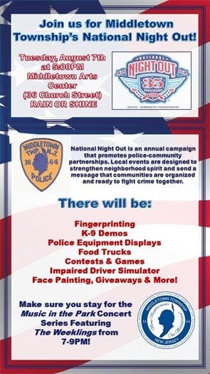 MIDDLETOWN, NJ — Middletown's National Night Out event will be held at the Middletown Arts Center on Tuesday, August 7!