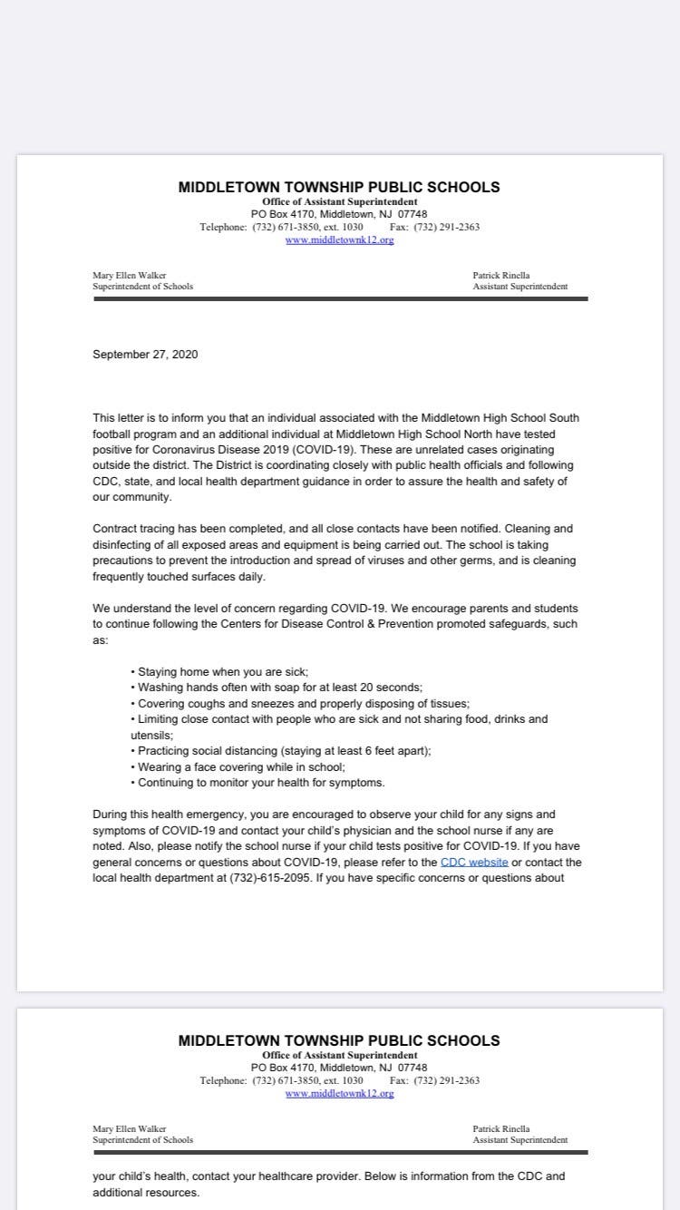 MIDDLETOWN, NJ — Someone associated with the Middletown High School South football program has been confirmed as diagnosed with COVID, according to a letter sent out Sunday from Middletown schools assistant superintendent Patrick Rinella.