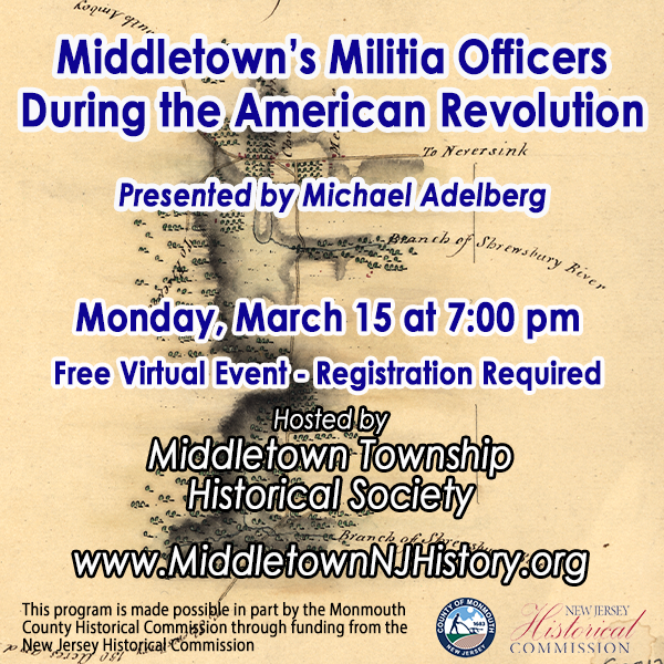 MIDDLETOWN, NJ — On Monday, March 15 author and historian Michael Adelberg will present a virtual history talk: "Middletown's Militia Officers During the American Revolution."