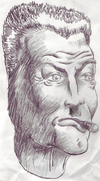 Another piece I liked – also long gone – was a clay piece I did in a sculpture class. It was a facemask of a scowling middle-aged man with a crew cut and a Charlie Chaplain moustache. Out of the corner of his mouth was a short cigar butt.