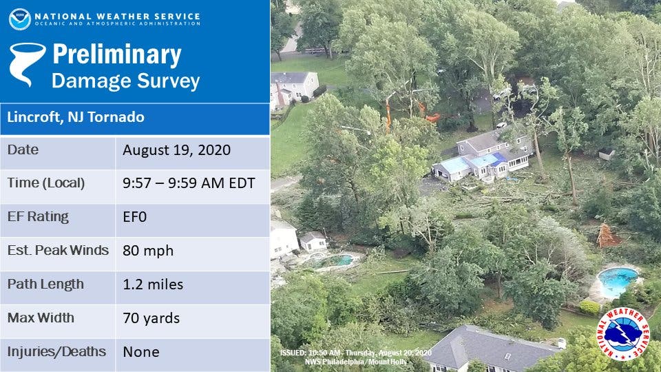 We have confirmed that an EF0 tornado touched down yesterday morning, August 19, just before 10AM in the Lincroft section of Middletown Township, NJ. See the Public Information Statement for more. https://t.co/yhmjWVPDDX #NJwx pic.twitter.com/0g3O4x4r6W