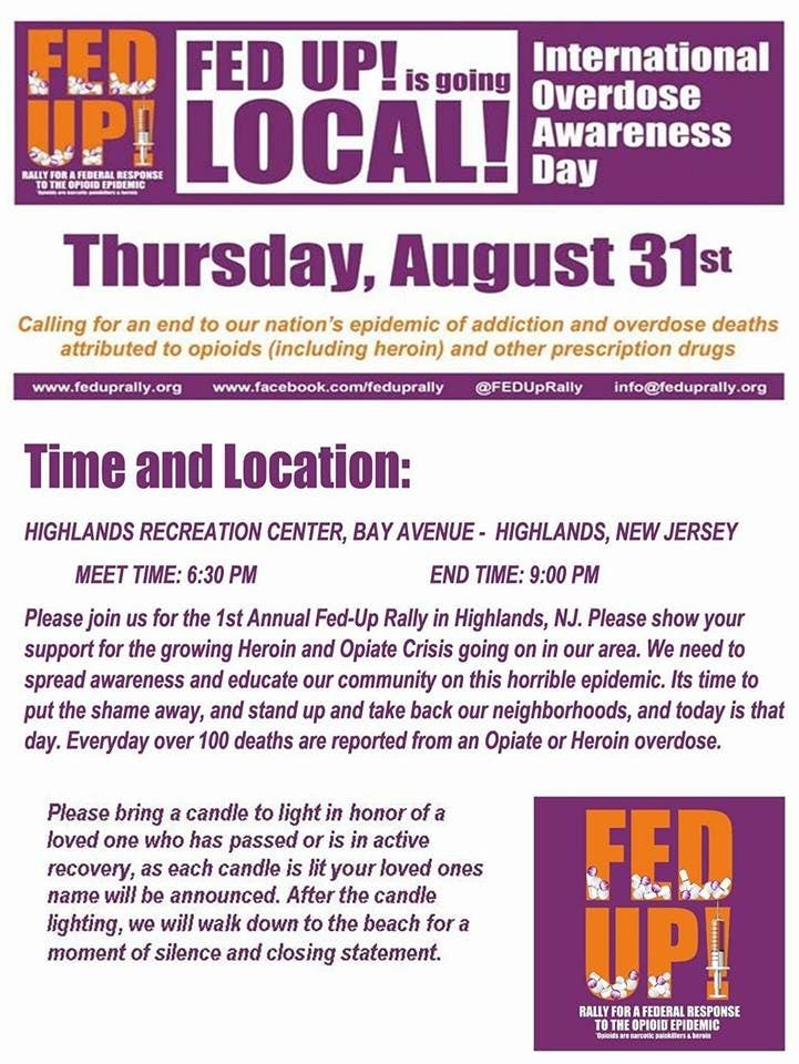 This will be the first annual Fed Up Rally in Highlands, NJ. All are invited to come from 6:30 to 9 p.m. Thursday to the Highlands Recreation Center at 171 Bay Avenue. Bring a candle to light in honor of a loved one who has passed away or is in active recovery. As each candle is lit, your loved one's name will be announced. After each candle is lit, they will walk down to the beach for a moment of silence and a closing statement.
