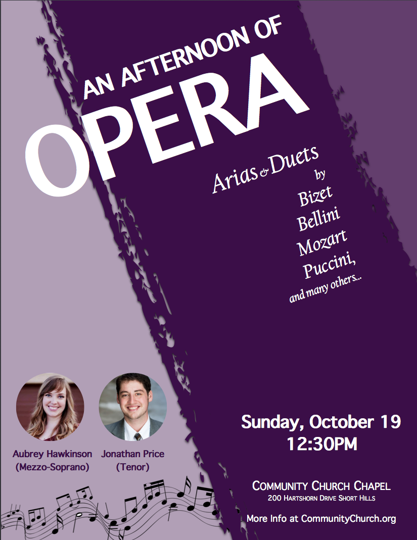 Aubrey Hawkinson & Jonathan Price perform popular opera arias in “An Afternoon of Opera” featuring pieces and duets by Bizet, Bellini, Mozart and Puccini. The concert is hosted by Community Congregational Church located at 200 Hartshorn Drive, Short Hills.