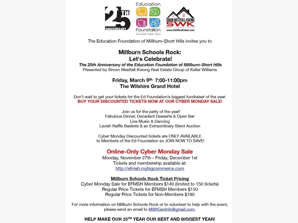 During the Cyber Monday sale, Ed Foundation members can purchase tickets for $140. The regular member price is $150. Only Ed Foundation members can take advantage of this discount, but memberships can be purchased when buying tickets. Non-member ticket price for Millburn Schools Rock will be $180.