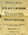 For years the exact location of McCollum's remained a mystery until very recently when a high-resolution scan of a tiny 1895 photo of the center of Millburn (see left side of photo here) revealed a sign that said "W.W. & W.E. McC------M." The sign was on the porch of a quaint building opposite what used to be the "Milburn Hotel," which was where Starbucks is now. Mystery solved! The McCollum brothers' store was where Pierre Deux is now at 344 Millburn Avenue. It too can be seen behind the facade that is now the French decorating store.