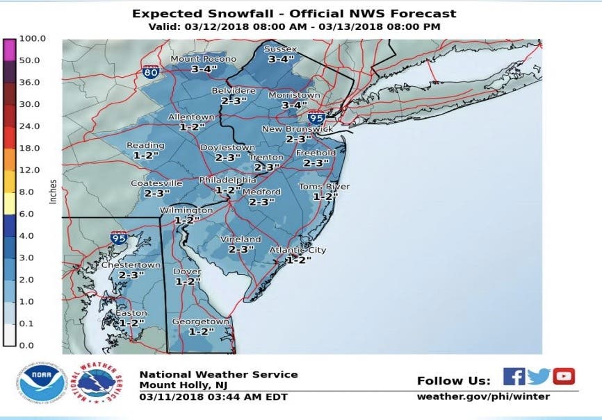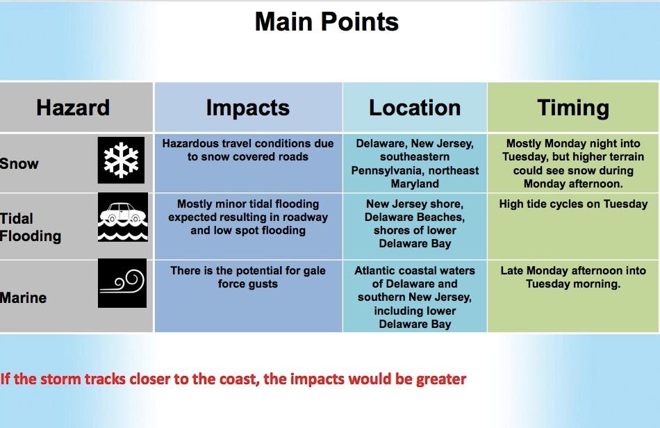 The NWS has issued a hazardous weather outlook for the entire state, saying the rapidly intensifying storm will probably impact New Jersey with 3-4 inches of snow beginning late Monday afternoon and lasting into Tuesday morning.