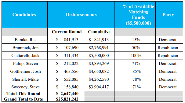 As of Thursday, a total of $25,821,242 has been disbursed to the qualifying candidates (no disbursements were listed for Bill Spadea):
