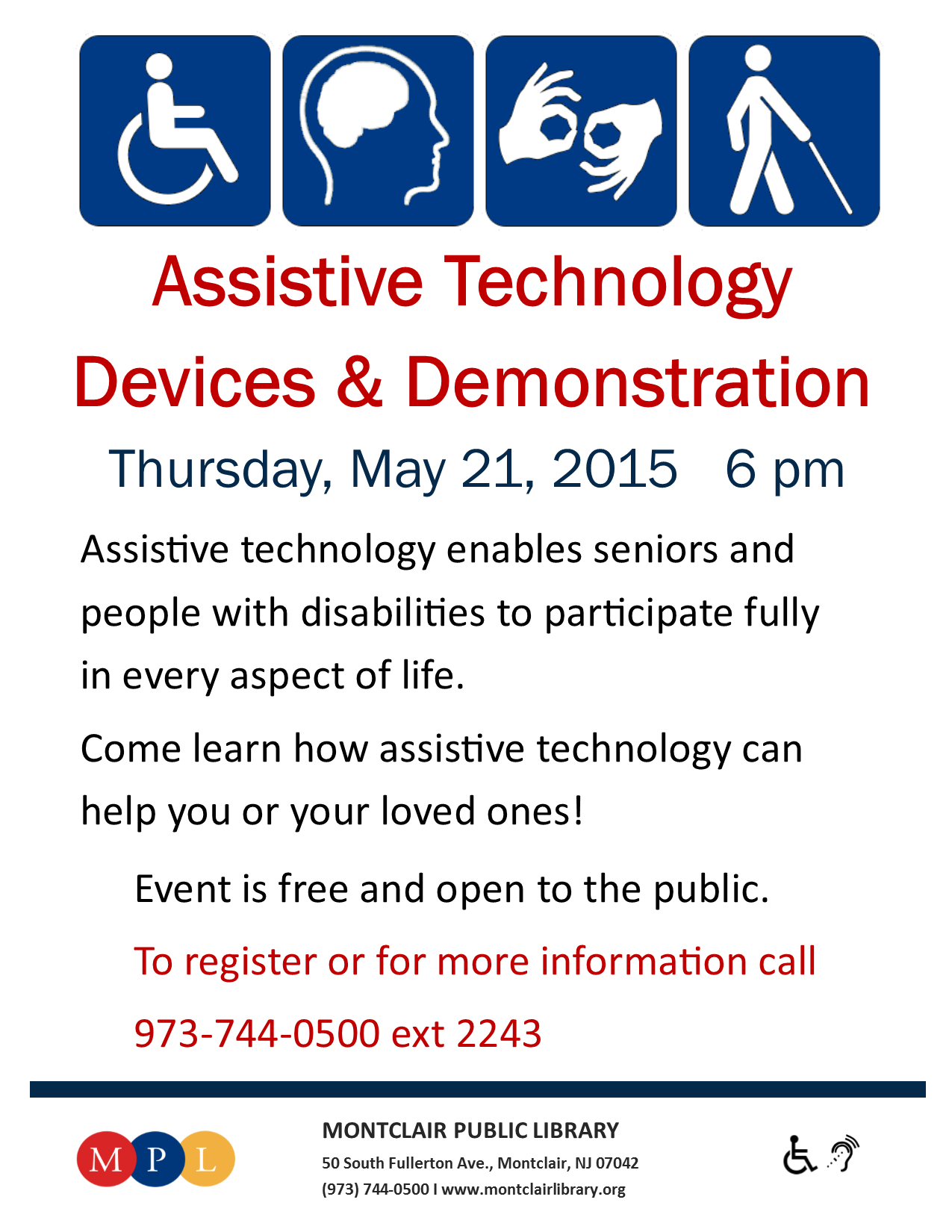 This event is free and open to the public, but registration is recomended. MPL is accessible and assistive listening devices are available upon request. Register online, call (973) 744-0500 ext 2235 or email reference@montclair.bccls.org.