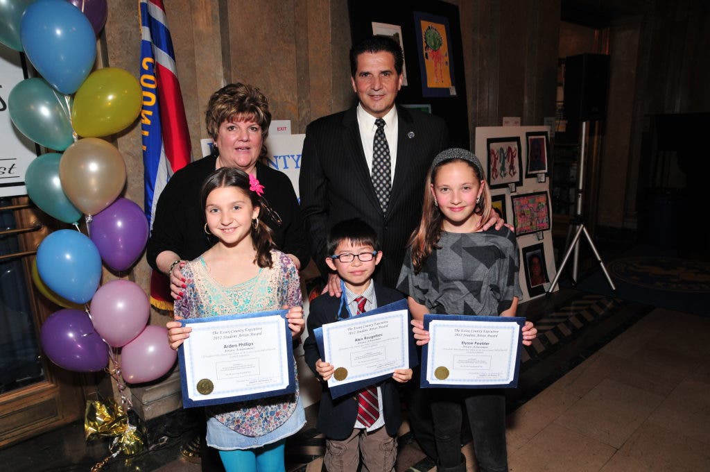 Students attending the ceremony were (from left) Arden Phillips, Alex Rougebec and Elysse Peebler. Also with the County Executive are New Jersey Art Educators Exhibit Chairwoman Marion Resciniti. The artwork was on display for the month of March.