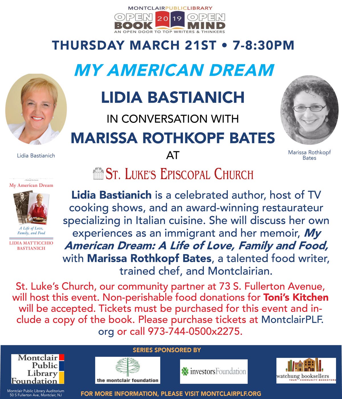 Montclair Public Library and St. Luke's Episcopal Church will host Lidia Bastianich, author of eleven cookbooks and Emmy award-winning host of public television’s “Lidia’s Kitchen,” to discuss her book My American Dream: A Life of Love, Family and Food, published by Penguin Random House in 2018. Lidia will be in conversation with Montclair food writer Marissa Rothkopf Bates, a trained chef and author of Newsweek’s “Gadget Lust” column.