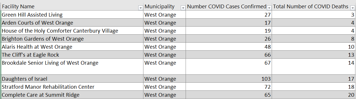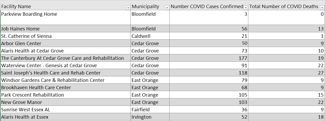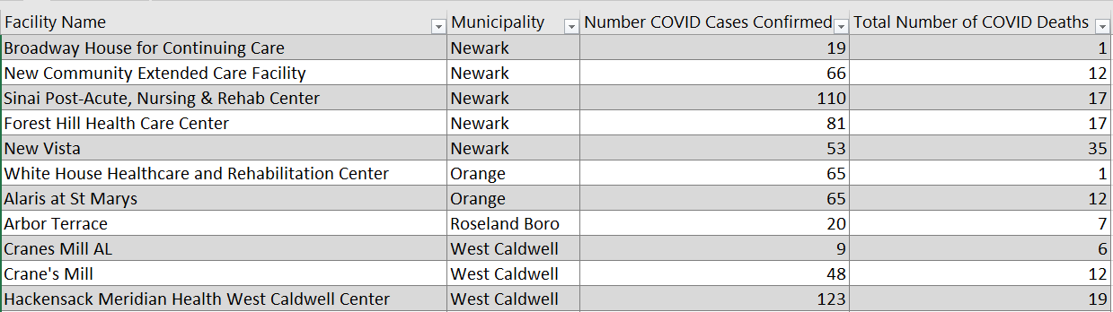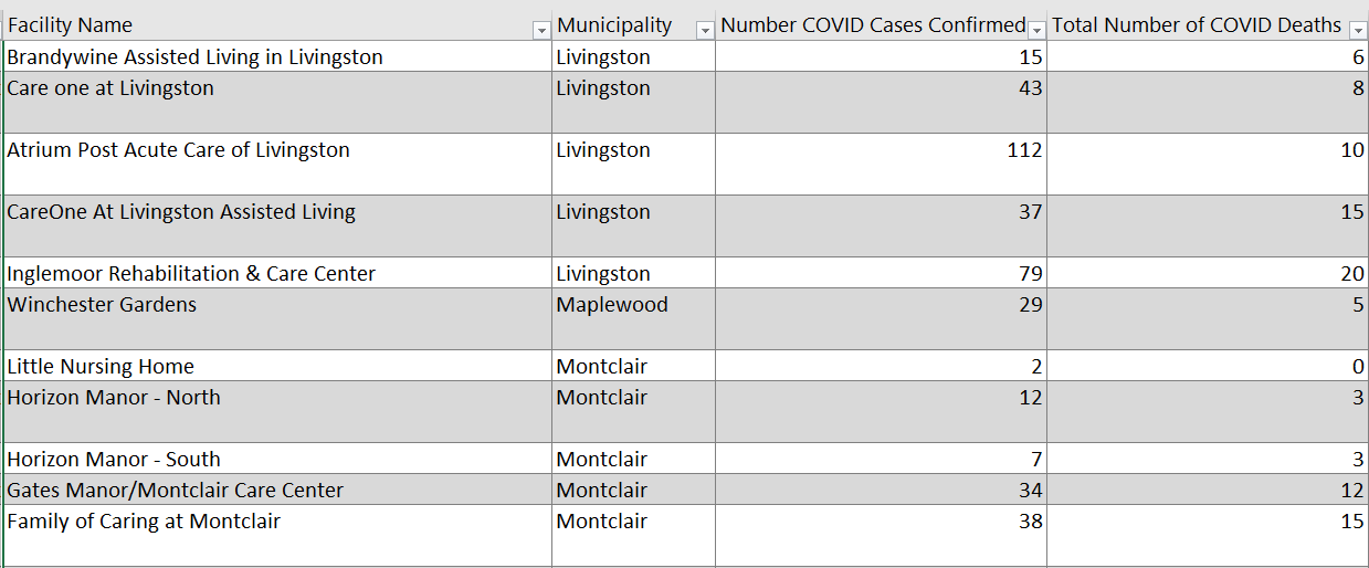 As of Sunday afternoon, there were 2,637 cases and 538 deaths at 46 long-term care facilities in Essex County, a 20.4 percent fatality rate, according to the New Jersey Department of Health.
