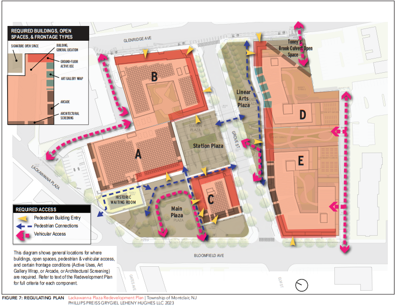 Five new buildings (five to six stories) are allowed, with maximum heights of 60 to 85 feet (as measured from the street line). The plan also includes stipulations that aim to preserve historical elements of the plaza, including a train terminal that once made a list of the “Most Endangered New Jersey Historic Places.”