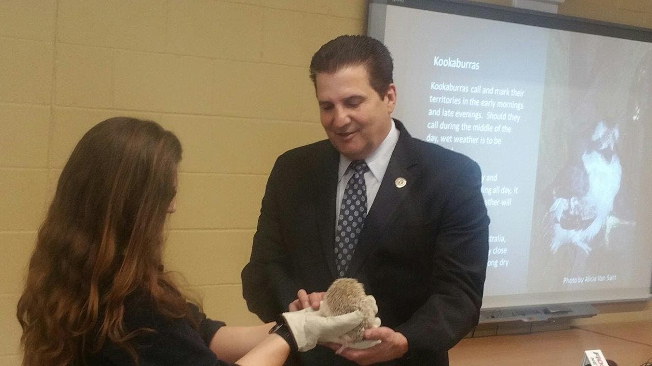 Photo caption: Essex County Executive Joseph DiVincenzo, Jr. (right) and Essex County Turtle Back Zoo Education Animal Care Keeper Katy Smith Bower present Otis the Hedgehog.