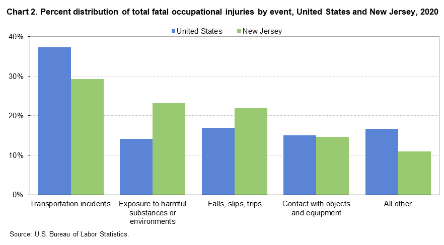 In New Jersey, just three major categories accounted for 74 percent of all fatal workplace injuries: “transportation incidents” (24), “exposure to harmful substances or environments” (19), and “falls/slips/trips” (18).