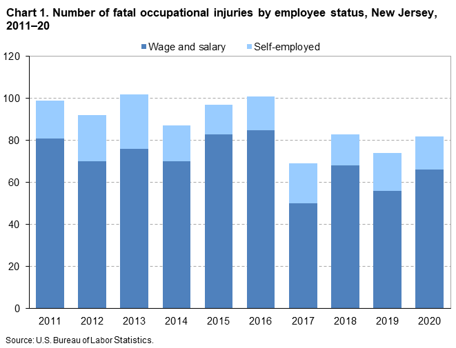 The U.S. Bureau of Labor Statistics has released its latest fatal work injury report for New Jersey, which covered 2020, the most recent data available. There were 82 fatal work injuries that year, up from 74 in 2019.