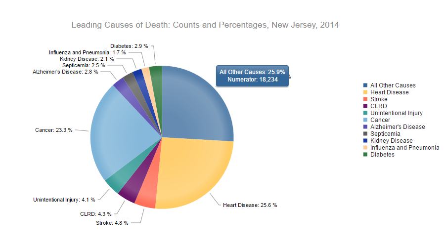 According to the New Jersey State Health Assessment Data website, here are the 10 leading causes of death in the Garden State for 2014.