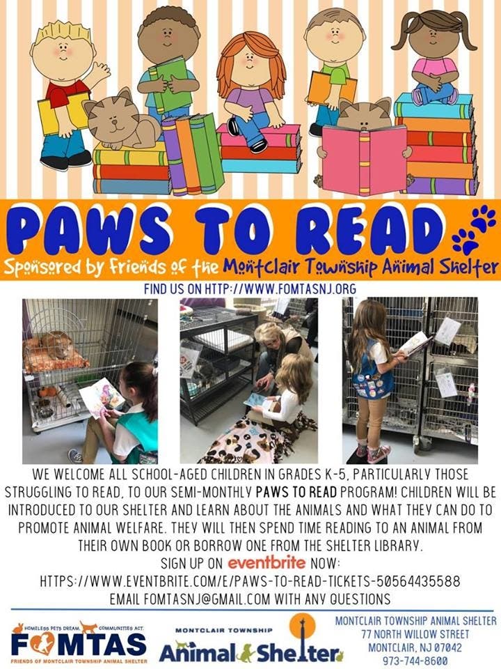 The municipally run shelter is teaming up with the Friends of the Montclair Township Animal Shelter (FOMTAS) and the Albert Payson Terhune Foundation to launch its new “Paws To Read” program. As part of the initiative, local children who want to get some reading practice can visit the shelter and sound out their favorite book for the four-legged residents of the facility.