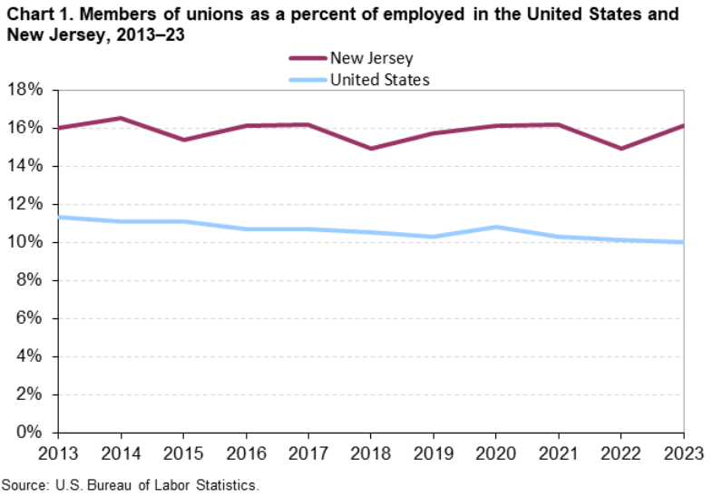 “The union membership rate for [New Jersey] was at its peak in 1991, when it averaged 24.3 percent, and at its low point in 2018 and 2022 at 14.9 percent. Nationwide, union members accounted for 10 percent of employed wage and salary workers in 2023. The rate was little changed from the previous year. Since 1989, when comparable state data became available, union membership rates in New Jersey have been at least 4 percentage points above the U.S. average.”