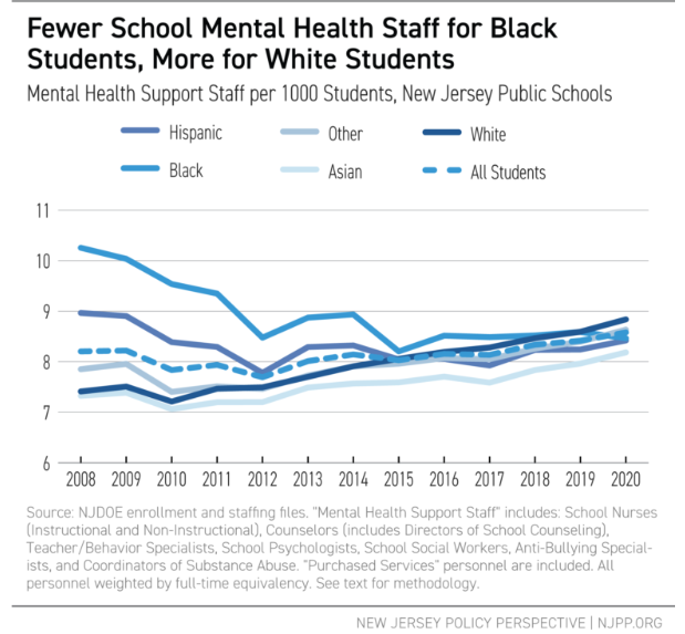 The report took a look at the number of mental health staff such as nurses, counselors, behavior specialists, psychologists and social workers in schools across New Jersey compared to the number of students of different races and ethnicities enrolled in those schools.