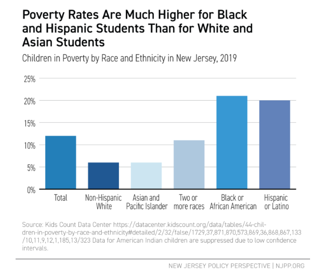 This argument, however, “fails to recognize a basic truth,” the study retorts: Black and Hispanic students in New Jersey are more likely to live in households with less money than their white and Asian peers.