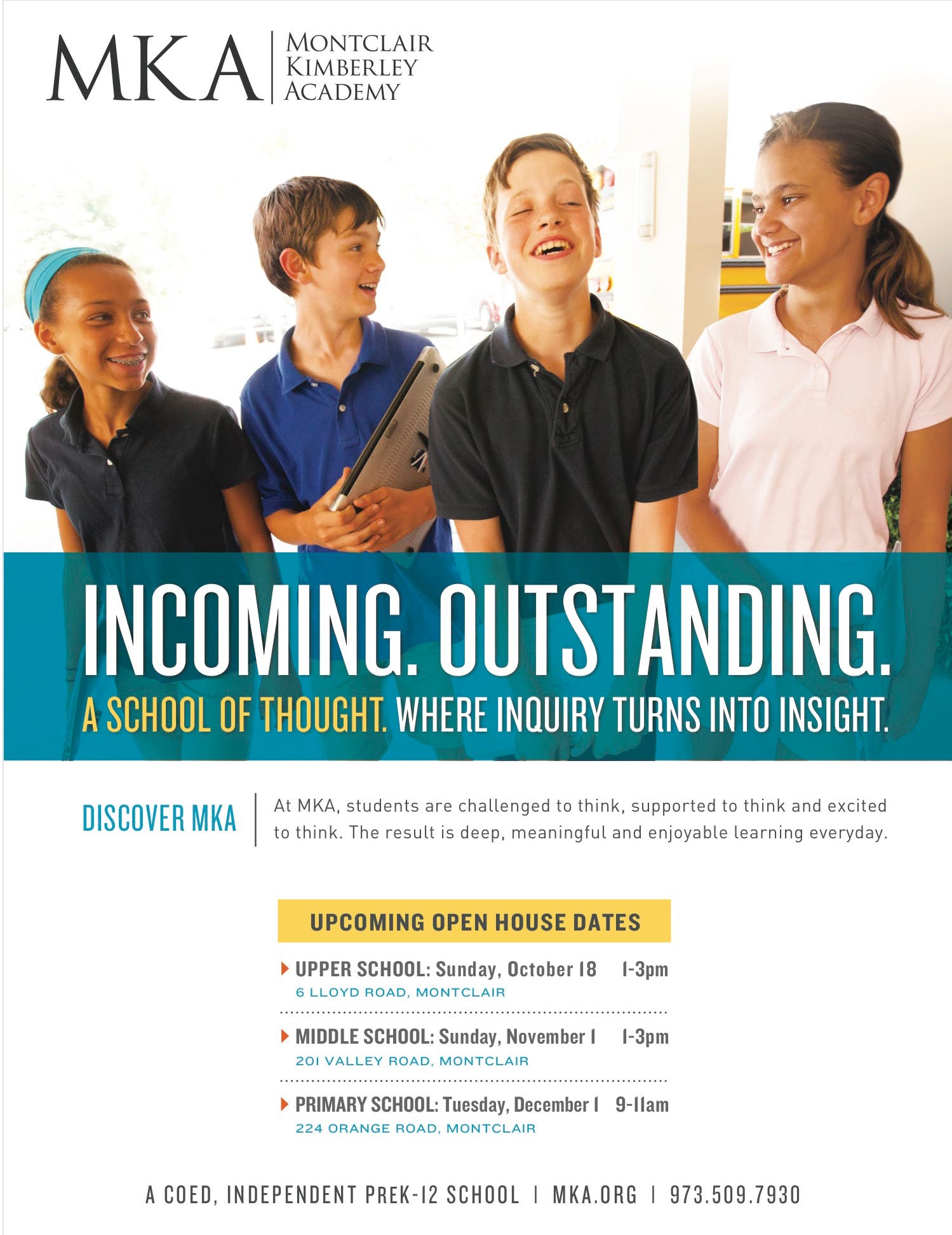On Sunday, October 18, there will be a Montclair Kimberley Academy Upper School Open House for families interested in grades 9-12 at the Upper School Campus, 6 Lloyd Road, Montclair, from 1:00 – 3:00 p.m. Walk- ins welcome!