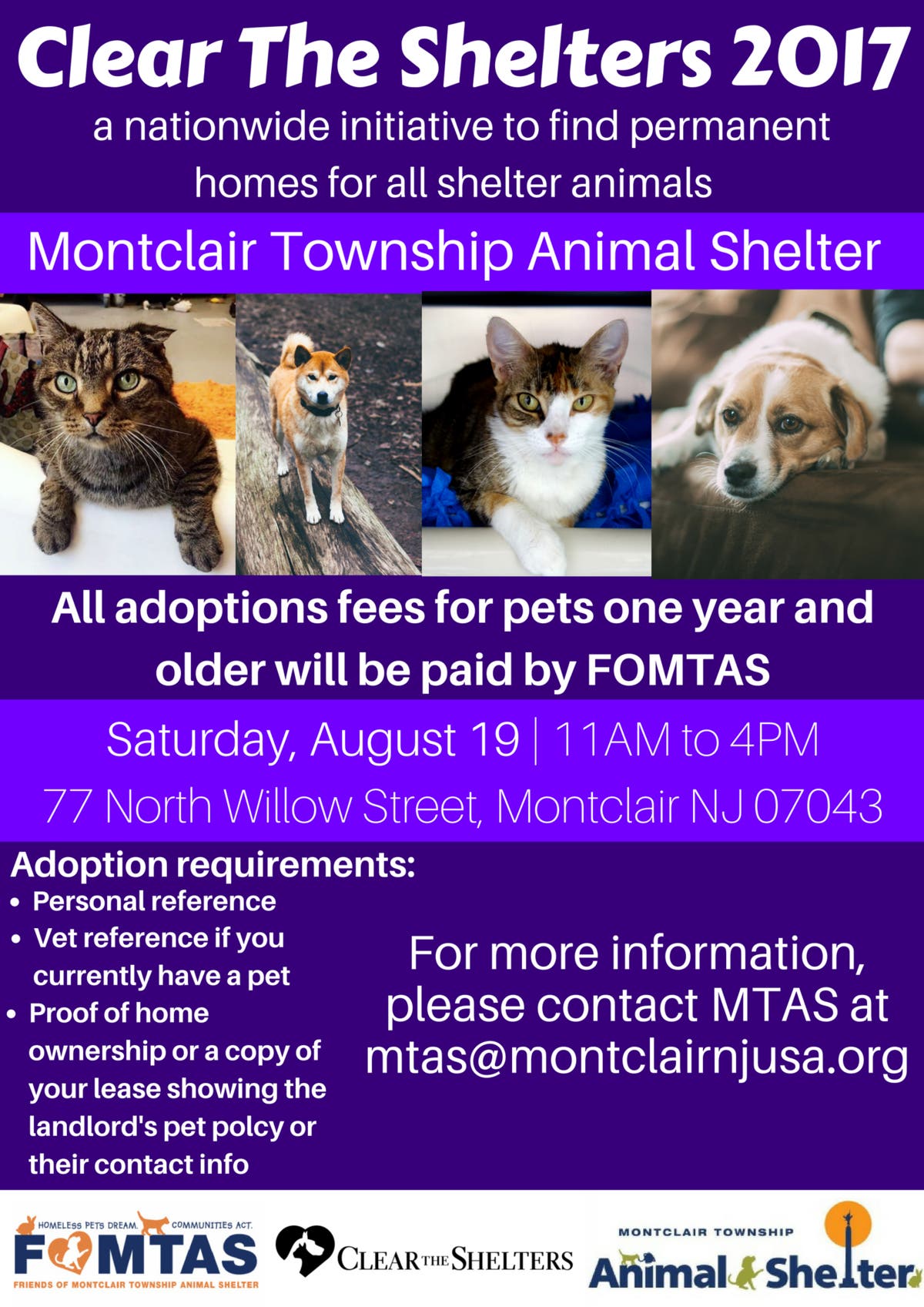 The Montclair Township Animal Shelter (MTAS) will join with NBC 4 New York/WNBC and Telemundo 47/WNJU to host NBCUniversal Owned Television Stations’ Clear the Shelters third annual nationwide pet adoption drive on Saturday, August 19. On this day, MTAS will offer waived pet adoption fees as part of the nationwide Clear the Shelters initiative that seeks to help families find and adopt homeless pets.