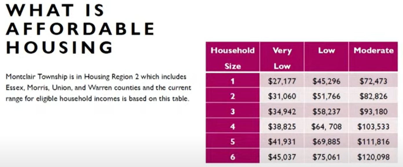 Talley shared a chart that lays out the income limits for affordable housing in Montclair (article continues below):