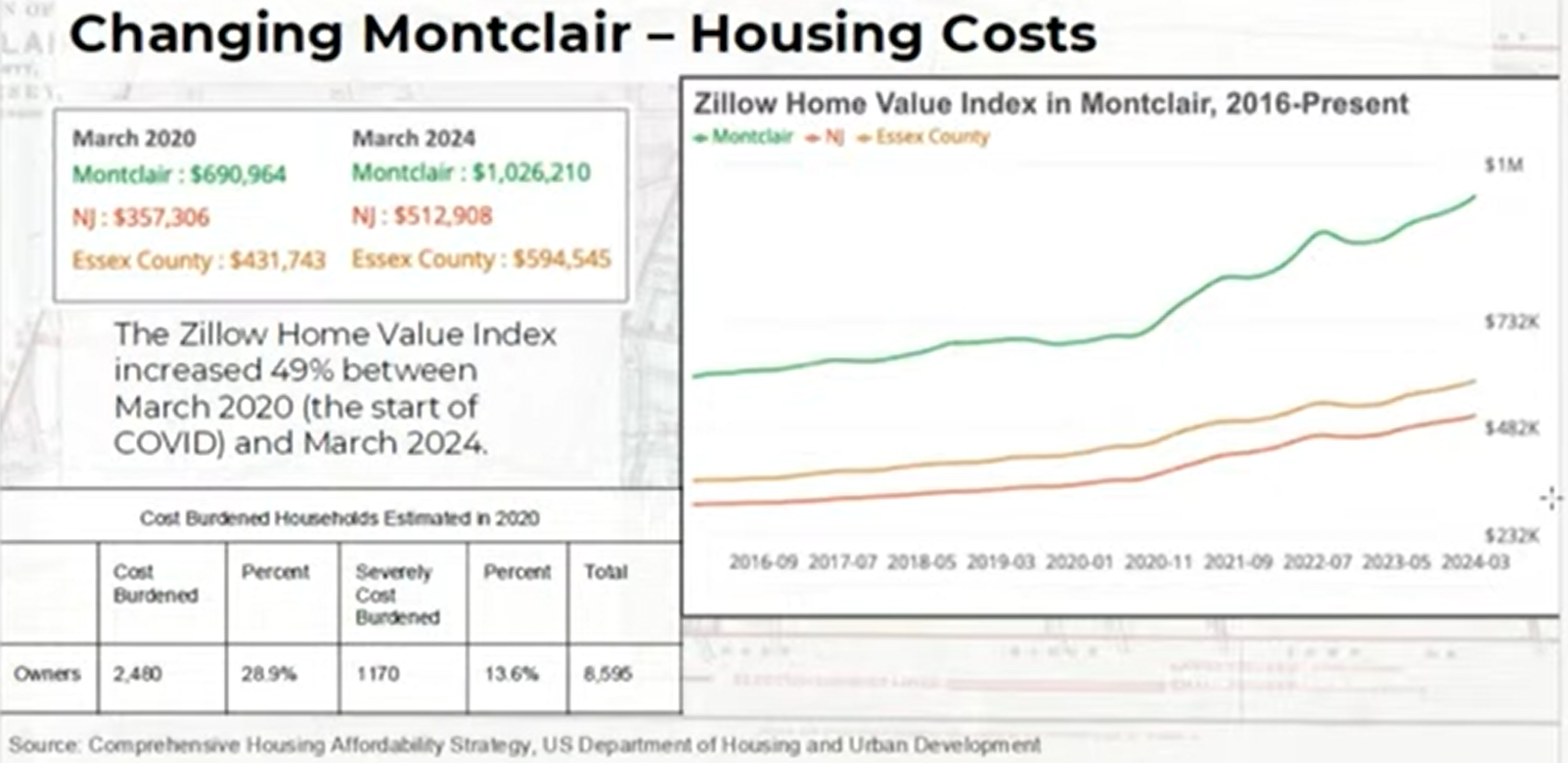 According to Talley, the sales prices of homes in Montclair have increased “significantly” – and are also outpacing incomes. That point was seconded by William Scott, a member of the Montclair Housing Commission, who presented figures that show a newly constructed single-family home in the town now tops $1 million.