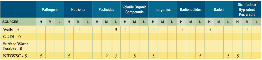 For Montclair, only its three municipal wells were assessed, which is why each contaminant has a “3” below it falling under the (H) (M) or (L).