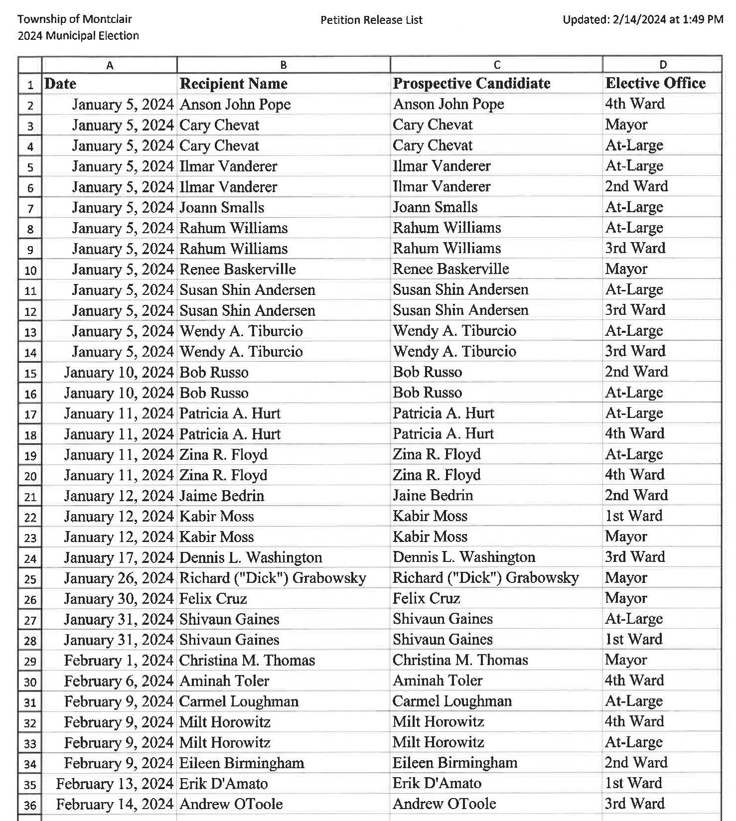 According to the Montclair Township Clerk’s Office, here are the candidates who have picked up packets as of Feb. 14 (article continues below):