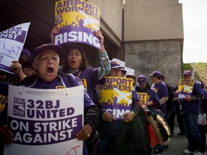 Photo via 32BJ SEIU (union members on strike at Newark Airport)