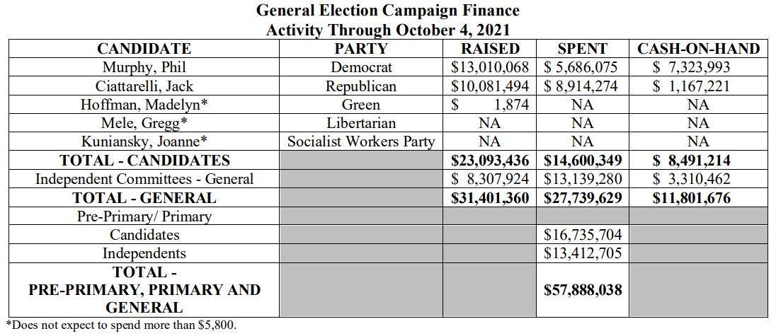 - “Combined with spending during the primary and pre-primary, total spending for the election is $57.9 million to date. That is more than the $52.9 million spent at this point in the campaign in 2017, when Governor Phil Murphy first ran for election.”