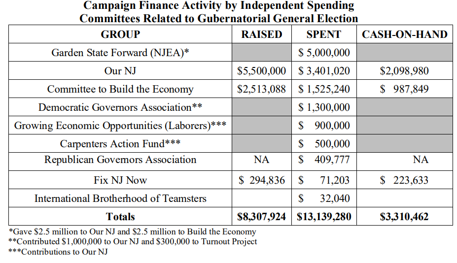 Among independent groups, Our NJ, a political committee formed by the Democratic Governors Association (DGA), has raised the most to date. It has raised $5.5 million and spent $3.4 million, according to filings with ELEC.